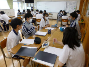 これまでの「平和」学習のまとめとして、本時の授業では平和の定義について考えました。現在の世界、日本、自分の身のまわりは平和であるといえるかどうか、グループごとに意見交換をしています。戦争、飢餓や感染症、教育、治安の問題などさまざまな観点から考え、平和に暮らすことの尊さについて改めて学ぶ機会となりました。