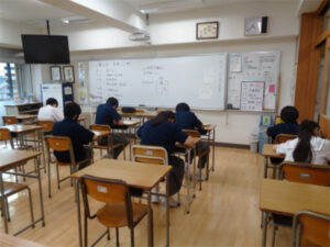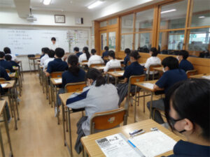 今年度2回目の英語検定を実施しました。2級から5級まで約120名が受験し、高校レベルの準2級、2級には2年生も多く挑戦しています。生徒たちは自主学習ノートに単語を練習したりライティングの練習をして先生に添削してもらったりと、当日まで意欲的に学習をしてきました。本番も緊張感が感じられ、夏休みも経て培った力を、受験した全員が発揮したと思います。