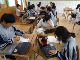 今日はまずディベートの立論の段階までを行い、その後はチームごとに相手側の立論を基に、反対尋問で相手に尋ねる内容や、相手側が尋ねてくるであろう内容を予測しその答えを用意する、という活動を行いました。