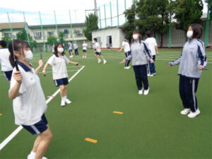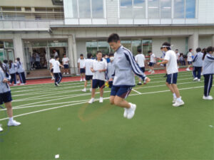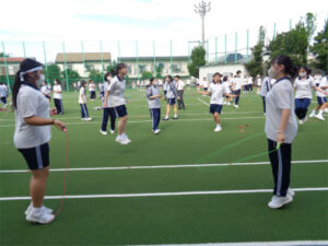 スポーツ大会に向けて「縄跳び」練習が盛り上がりを見せています。全員参加の種目「チャレンジ・ザ・ロープ」は、学年で決まっている跳び方で規定の時間(例えば、3年生はあや跳び40秒)を跳びきると、1人1点がチームに入る競技です。大会を盛り上げるため、スポーツ推進委員会の生徒たちが企画したプロジェクトの効果もあり、朝や昼にチーム内で誘い合って運動場が埋まるくらいの生徒たちがはしゃぎながら練習に励んでいます。