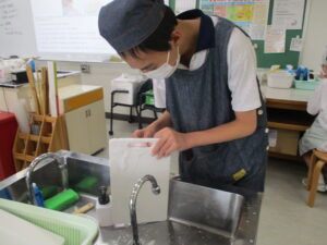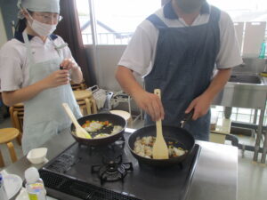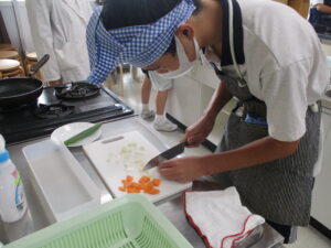 「実習・体験」は2時間続きの授業で、生活に必要な技術を、経験を通して身につけていきます。調理技術の向上だけでなく衛生面や食品の管理、食器洗いと片付け方なども学んでいます。今日の調理実習ではニンジンのイチョウ切り、長ネギの小口切りを行い、チャーハンを作りました。包丁の作業は今までの積み重ねもあり、切ってから刃をまな板の前へ滑らせるようにするというコツを意識している生徒が多かったです。厚さをできるだけ薄く均等に切ることはこれからの練習で身につけていかなければいけません。また焦げないよう手際よく混ぜながら炒める作業もこれから増やしていきます。