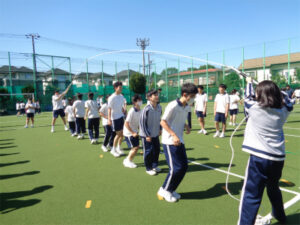 スポーツ大会が近づくにつれて3年生の目の色が変わってきています。昼休みに全チームが運動場に集結し、学年競技「大繩回し」の練習を繰り返し行っていました。縄を回す人、跳ぶ人の呼吸が少しでも乱れると引っかかってしまうため、声をかけあったり、間隔を微調整したりして熱のこもった様子が見られました。他の競技に出る3年生も自分のチームにアドバイスや声援を送るなど、最後のスポーツ大会にかける3年生の意気込みが日に日に高まっています。