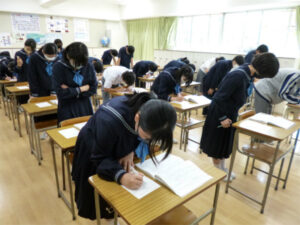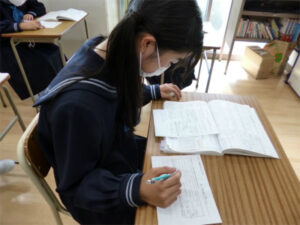 本校には、自立した学習習慣やPDCAサイクルを身に付けるための「自主学習プランノート」というオリジナルノートがあります。週の目標を立て、それを達成するために日々どのように時間を管理し、どういう内容の学習を進めるかを計画するノートです。今回は他の学年の生徒のプランノートを見て、工夫を学ぶ機会を持ちました。また3年生は1年生のプランノートを見て、アドバイスを行っています。今回の研修を自分のプランノートに活かし、より良いものを目指してほしいと思います。
