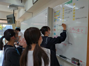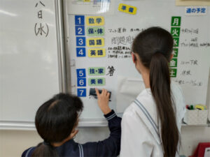 今週から後期クラス委員、クラス係がスタートしています。クラス委員はどのクラスも立候補が複数出るなど、学校生活に積極的に関わっていこうとする意欲が芽生えています。画像は各教科の係が帰りのHRまでに先生から明日の準備を聞き取り、クラスのホワイトボードに記入している様子です。1年次の折り返しを過ぎました。皆がそれぞれの場面でリーダーシップを発揮していくことを期待しています。