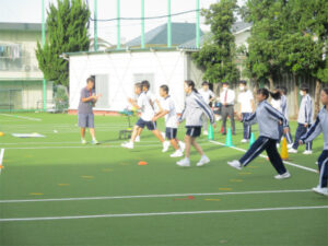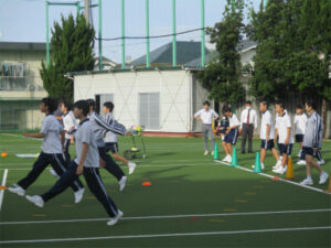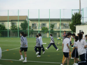 本校では教科の枠にとらわれない教科横断型の授業を「コラボ授業」としてカリキュラムに組み込んでいます。今回は1年生において、音楽のリズムを走りに生かすことをテーマに実施しました。3つのリズム(走リズム、呼吸リズム、心拍リズム)を同調していくことが理想的な走りに結びつきますが、この3つを上手く結びつけるのが音楽のリズムです。そこで音楽の先生から強迫、裏拍、細かいリズムの3要素を異なる曲を聞きながら身体を動かしてリズムをつくっていきます。リズムの感覚が取れたら、スキップやツーステップなど陸上の走りに近づけた形で練習を行いました。今後の授業の中でも更に応用した形で取り入れていきます。