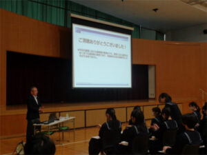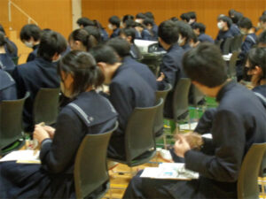 毎年総合テスト後、2・3年生AB組を対象に「金融・経済に関する講演会」を実施しています。今年度は全国銀行協会から金融インストラクターの方をお招きし、「銀行のしごと」をテーマにお話しいただきました。今年も社会科的な観点に加えて、生命科の「将来観」についても参考になるように工夫していただいています。内容は、銀行クイズを皮切りに、銀行のいろいろな仕事、フィンテックなどの最近のトピックス、金融業界で働くことのやりがいまで多岐にわたりました。全員に模擬紙幣が渡され、札勘の体験を楽しむこともできました。金融について初めて学ぶ2年生には身近に感じられ、公民の授業で学んでいる3年生にはより理解が進む講演でした。