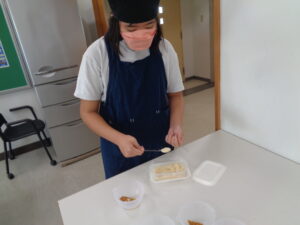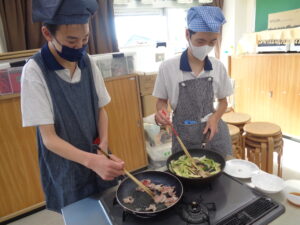今回の調理実習はピーマンとナスの細切りとキャベツのせん切りを行いました。今まで色々な野菜を切る際包丁を前へ押し出すように切るという技術が身にき、表面が滑りやすいピーマンとナスでもスムーズに切れている生徒が多かったです。切った野菜はみそと味醂であえて炒めて食べました。