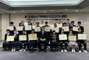 12月9日(土) 第37回毎日カップ「体力つくりコンテスト」の表彰式が毎日新聞社本社にて行われました。本校は全国で4072校がエントリーする中、9月に第一次審査で上位300校に選ばれ、11月の第二次審査~最終審査を経て全国上位32位以内となる優良賞を受賞しました。このコンテストは中学3年生の体力テストの結果をもとに、3年間での体力の伸長や日々の取り組みを総合的に評価し、審査する権威あるコンテストです。