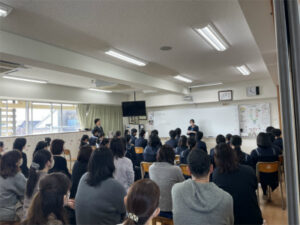 「生命科」は自分の存在の重さを知り、他の人の命の重さも感じることのできる生徒であることを願って設置されたものです。3年間、週1回の授業の中で「考え」「感じ」てきたことを作文用紙1枚にまとめる作業はなかなか難しいものでしたが、それぞれが印象に残った単元や授業を振り返りまとめていきました。積み重ねているからこそ、「死」を扱った題材では心が大きく動き、「生きる」ことの意味を考え自分の命の重さも感じながら、自分以外への思いや考えが広がってきていることもわかる発表でした。なかには3年間の学びから自分の成長を振り返る発表もありそれぞれの「らしさ」も垣間見ることができました。一人1分程度の発表ですが、それを聞くクラスメイトと多くの保護者の皆様の温かい視線の中、緊張しながらも堂々とした発表となりよいまとめとなりました。