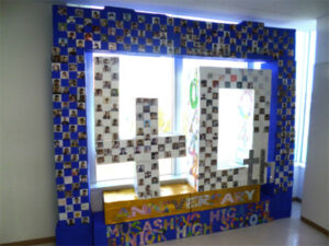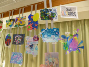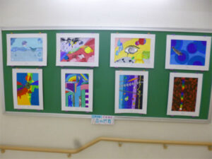 校内には、生徒たちの美術作品がたくさん展示されています。1年生の作品は「色面構成:音の世界」、2年生の作品は「きもちのかたち」をテーマとし、目には見えない音や気持ちをそれぞれの解釈で色鮮やかに表現しています。また今年度の学園祭にて共同制作したオブジェには、全校生徒の顔写真が貼ってあり、創立40周年をお祝いするものとなっています。他にも校内にはさまざまな作品があり、日頃から生徒たちは芸術の心を養っています。