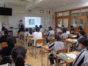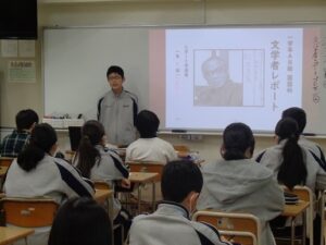 1学年AB組の国語では、2学期に作成した「文学者レポート」をもとにプレゼンテーションを行っています。内容は、誕生~文学を志した理由、文学の特徴・テーマ、お勧めの一冊、エピソード~死去という流れで、一人2分~2分半の発表時間です。有名な文学者のポイントを凝縮した発表になっていますので、飽きずに聞くことができ、聞き手も刺激を受けているようです。この学習を通して、文学への興味・理解を深め、読書活動や表現活動に広げていって欲しいと思います。