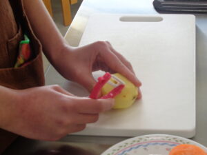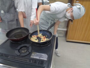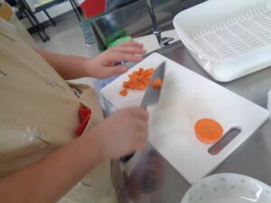 今日の実習は調理で人参とジャガイモのさいの目切りを行いました。まずピーラーを使ってジャガイモの芽をとります。ピーラーの刃の両サイドにある突起部分で芽を掘り起こし、上手にとることが理解できました。実を削りすぎないように作業することは今後の課題です。またさいの目にする際にまず棒状に切りますが薄く切りすぎないように意識できていました。最後にジャガイモやニンジン1つからさいの目に切っていく手順を再確認しました。切った野菜はレンジで温めてから片栗粉をまぶして炒め、塩で味付けをして美味しくいただきました。