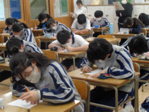 2年生は、「命の尊厳」をテーマに生命科の学習を進めています。前回から、院内学級に通った経験のある先生のお話を聞き、命について考える授業を行ってきました。院内学級は、学習の場であると同時に、精神的な居場所であることを実感したようです。また、そうした経験を自分と重ね合わせた時、どのように病気や困難と向き合えばいいのか、考える時間にもなりました。