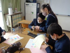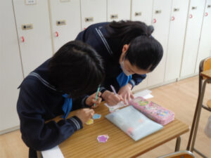 アクティベーション委員会が中心となり、縦割り班ごとに1・2年生が送別会に向けた準備を進めています。縦割り班は日頃から一緒に清掃活動をしていますが、今日は切ったり貼ったり書いたり。普段と異なる活動を通して、また違った一面が見えたようです。どのような送別会になるかは当日のお楽しみです。