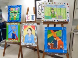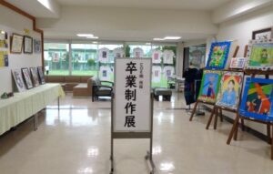 卒業を間近に控え、ロビーでは3年CDE組の生徒が「技能」の授業で作った卒業制作を展示しています。陶芸、切り絵、クラフト、PC、手芸、絵画、それぞれの技能に1年間(同じ技能を続けてきた生徒の場合は3年間)取り組んできた成果が並ぶ様子は壮観です。3月11日(月)まで展示をしていますので、ぜひご覧ください。
