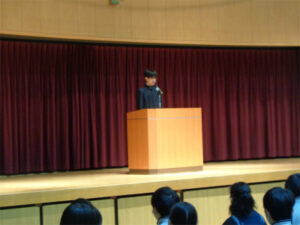 本校では、一年間の英語学習のまとめとして、英語スピーチコンテストを毎年校内で実施しています。今回もクラス予選を勝ち抜いた18名が、本選に出場しました。1年生は”My favorite”、2年生は”My Memory”、3年生は”My opinion on SDGs”がテーマです。審査の大きなポイントは「伝える力」です。流暢さ、スピード、文法、表現力等を、どれくらい達成できているかを、英語科・ALTの先生が評価します。どの学年においても、テーマに合った内容の濃いスピーチができました。特に3年生は、高い英語力だけでなく、聞き手に訴える力も感じられる、圧巻のスピーチを披露しました。今年度の学習の成果を十分に発揮していました。