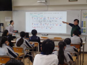 1年生AB組の国語の授業では3学期に文法の品詞概要の学習を行い、また英語の授業では助動詞の単元に入ったところです。そこで今回は宮沢賢治作「雨ニモマケズ」を題材に、国文法と英文法の違いについての理解を深めるコラボ授業を行いました。国語と英語とでは基本的な文の構造に違いがあることは生徒も理解していますが、単語=品詞の違いについて理解するのは非常に難しいことです。そこで「雨ニモマケズ」を品詞分解した上で、主語の存在、述語における時制について考えながら英訳を行いました。多くの生徒にとって難しかったのは、国語でいう助詞が英語のどの前置詞に該当するかでした。答え合わせの後には発展として「雨ニモマケズ」と「ソウイフモノ二ワタシハナリタイ」の英訳3パターンを提示しましたが、翻訳者による表現の違いに驚くとともに、英訳に対する興味関心が持てたようです。