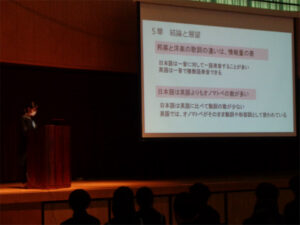 探究科の校内審査で見事優秀賞に輝いた生徒3名がプレゼンテーションを行い、1~3AB組の生徒が発表を聞きました。優秀賞に選ばれた作品は「視覚に不安のある母にとって見やすい文字とは」「美しい日本語」「もし中学生が夏休みに10万円稼ぐことを目指したら ~自力でプチ起業してお金を稼ぐ方法~」の三点。どれもオリジナリティに富んだ意欲作で、生徒たちは熱心に聞き入っていました。特に1年生はまさに今、個人探究のテーマを決めているところです。先輩の発表から学んだことを今後の探究活動に活かしていってください。