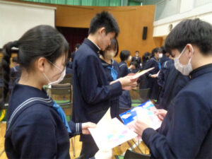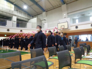 花のアーチをくぐり3年が入場した後、アクティベーション委員の司会・進行で、1年間共に清掃やレク活動で交流してきた縦割り班ごとにクイズに挑戦したり、3年間の思い出を振り返るスライドショーを観たりしました。その後、在校生はこの日の為に作成した花束を模した色紙を手渡し、感謝の気持ちを伝えました。3年生の中には涙を浮かべている生徒の姿もありました。在校生と卒業生の心の通った素晴らしい会となりました。