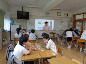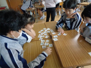 ‟Take one and pass them back.”(1枚取ったら後ろに回して下さい)のような授業で使う表現を学んだ後、それらの表現が書かれているカードでカルタ取りをしました。