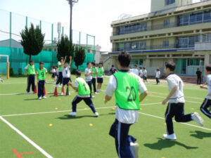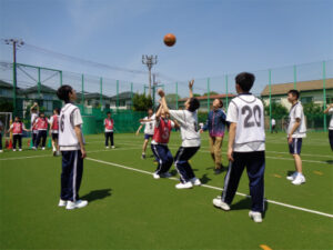 2回目の体験「レクリエーション」は、クラス対抗でポートボールを行いました。3年生になって2週間目。それぞれのクラスのまとまりもでてきています。新しいクラスでポートボールの試合を行うのは、この日が初めてでしたが、ゴールマン、ガードマン、ジャンプボール、そしてディフェンスとオフェンスなど、チーム内での役割やルールを確認しながら楽しく身体を動かしました。今年は最高学年ということで、どのクラスも球技大会に向けて気合いが入っています。