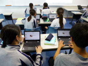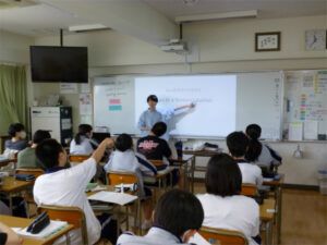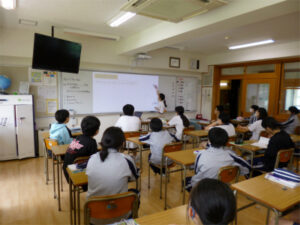 2年生の英語では、不定詞を学習しています。3つの用法など難しくなってくる内容に苦戦しながらも、英語を使っての自己表現の幅を広げていっています。ALTの先生に日本の便利グッズの用途を紹介したり、不定詞を使って自分のしたいことや行動の目的を伝えあったりしています。