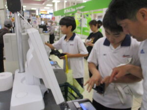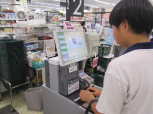 「体験・実習」は2コマ続きの授業で、実生活に必要なスキルを経験を通して学んでいきます。今日の体験は「スーパーマーケットでの買い物」です。事前にクラスで買い物の一連の流れについて確認してから店に向かいました。入店してから棚の表示を見て商品を選び、足元の印を見てレジに並ぶところまでは1年生のときよりスムーズにできています。セルフレジでの支払いでは「現金」や「カードを持っていません」という表示をタッチする必要があり、戸惑っていた様子が見られました。次回は支払いもスムーズにできるよう言葉の意味を再確認して臨みます。