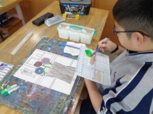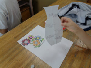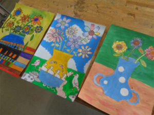 4月から取り組んでいた作品が完成しました。今回は「花と花瓶」がテーマです。花を飾るための花瓶は別の画用紙を半分に折って切り、そこにそれぞれが考えた模様や絵を描いています。はさみや絵の具、色鉛筆を目的に応じて使い分け、春らしい作品が出来上がりました。