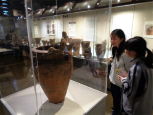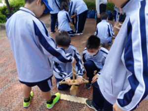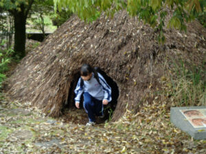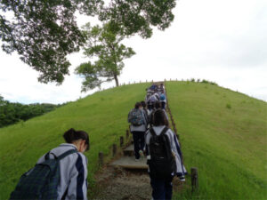 清里山荘合宿三日目は、山梨県立考古学博物館と甲斐風土記の丘を訪れました。考古学博物館では、復元した縄文時代の竪穴住居、甲斐銚子塚古墳、考古学博物館の常設展示室を見学しました。竪穴住居の中に入った生徒たちは、クラスの全員が入れるほどの広さに驚いていました。古墳は、巨大な円墳と前方後円墳の上に上り、当時の権力者の力を実感できたようでした。考古学博物館の展示物は、教科書で見たようなものがズラリと並び、皆、興味津々で時間をかけてじっくりと見学している姿が印象的でした。甲斐風土記の丘では、AB組とCDE組の合同班で火起こしの体験を行いました。協力して火がついた時には、班の全員が喜びを分かち合っていました。来週から再開する学校生活につながる、充実した合宿となりました。