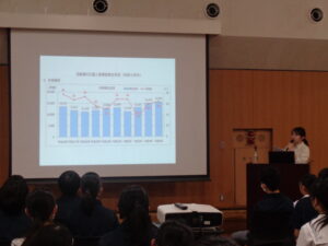 本校では毎年、ルールを守り安全に自転車を利用するために交通安全教室を行っています。近年、自転車事故の件数が一番多いのは中高生であること、事故の原因、事故の起こりやすい場所等について資料や動画をもとにスライドで解説しました。解説後、ワークシートで自分自身で心がけなければいけないことについて記述しています。自転車利用時は「安全確認」が大切であることを改めて学ぶよい機会となりました。