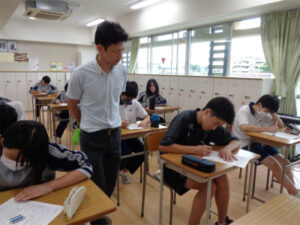 3年生の生命科では1学期に「平和」について学習しています。今回はコソボ問題を取り上げ、民族紛争で心の傷を負った子供たちを癒し、憎しみをくい止めようとする取り組みを追った映像資料を視聴しました。傷つけられ互いを憎む個々の視点と、平和に共存することを求める客観的な視点との間で、「平和」についてより深く考えるきっかけになったようです。生徒たちの感想には、「自分があの立場にいたら、簡単に心を開けないのは当然だなとも考えた。」「片方の民族だけが平和や共存を考えるだけでは意味がない。」という声がありました。