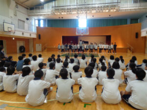 本番が近づいてきた合唱コンクールにむけて各クラス練習に励む中、2学年で合唱の交歓会を行いました。本番はA組、B組、CDE組に分かれ、それぞれが学年課題曲と自由曲の2曲を歌います。今日は初めて人前で歌うということで少し緊張した様子は見られましたが、のびのびと歌う姿が印象的でした。互いの歌声に良い刺激をもらい、ここからさらに完成度を高めていって欲しいと思います。