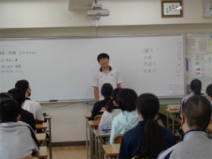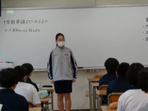 英語の授業では、「話す力」をはかる場として、学期末にスピーチテストを実施しています。各学年のテーマに沿って原稿を作成し、クラスごとに発表を行いました。今学期のテーマは1年生が”Self Introduction”、2年生は”My Dream”です。1年生は一般動詞とbe動詞を使い分けて、自分自身について話すことが目標です。2年生は不定詞を使って、将来の夢とその理由、実現のために何をするか等を話します。生徒一人ひとりが自分の英語で、伝えたいことを表現していました。2学期には校内で行う英語スピーチコンテストもあります。話す力をさらに高めながら、4技能を伸ばしていきます。