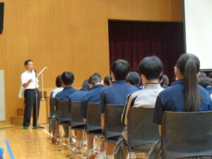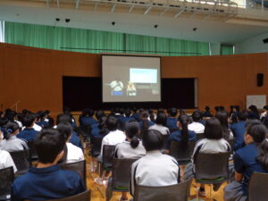 小金井警察署の方をお招きし、防犯教室を行いました。動画を視聴し、SNSやインターネット上での行動が、犯罪行為になったり、自身が被害にあったりすることなどを学びました。自分の思ったことをスマートフォン等で手軽に発信できる昨今、求められるのは発信する前に、正しいことなのか、発信してもいいのか等を、一度立ち止まって考える事です。また困ったことがあれば信頼できる大人に相談してほしいというアドバイスもありました。加えて、スマートフォン等の長時間利用による生活リズムの乱れ、学習の妨げ、不適切な情報等回避の為、使用には十分な注意が必要です。他に、不審者対応についても学びました。それらしき存在があれば、まず自らが先に気づくことが大切であることや、不審者に背後から抱きつかれたときの対処法も実演で教えていただき、有意義な時間となりました。