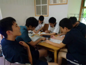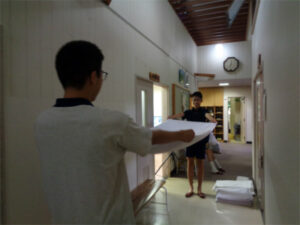 チロル学園合宿3日目は、予報通り朝から雨。起床後は、2人一組になってリネン類をきれいにたたみ、朝食の後は、館内清掃と農作業で使った道具の片づけを行いました。3年生ということもあり、一つひとつの行動の目的を理解して集中して取り組むことができています。清掃が一段落したら、農業従事研修の振り返りとまとめを、各自でしおりの「研修レポート」に記入しました。それぞれの日に行った作業内容や、頑張ったこと、感じたことなどをぎっしりと書く様子から、研修を通して多くのことを体験的に学んだことが伝わってきます。生徒からは、「いろいろな農作業ができて楽しかった!」「また来たいです!」との声が上がっていました。3日間の合宿を通して得たことを、これからの生活に活かしていきたいです。