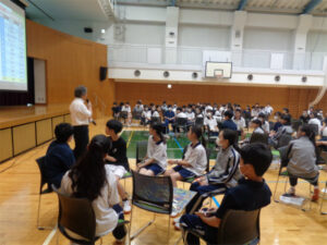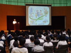 本校では、毎年、外部より講師をお招きして「ニュースリテラシー」に関する講演会を開催しています。一昨年、昨年に引き続き、読売新聞教育ネットワーク事務局アドバイザー、NIE企画デザイナーの田中孝宏氏をお招きして、「ニュースに触れ、考え、話し合おう」という演題で講演いただきました。縄文時代の人々はどのように情報を伝達していたのか、そこからどのようにしてメディアが誕生し、現在に至ったのか、様々な切り口から生徒たちに問いかけます。はじめは講演を聞く姿勢だった生徒たちが、どんどん主体的に発言していき、参加型の講演会となっていきました。シチズンシップ教育についても触れられ、武蔵野東中学校ではすでに実践されているとのお言葉もいただきました。第二部では、1〜3年生混合の班をつくり、「投票率75%を実現するための政策を考えてください」というテーマでグループワークを行いました。以下、生徒の感想を紹介いたします。