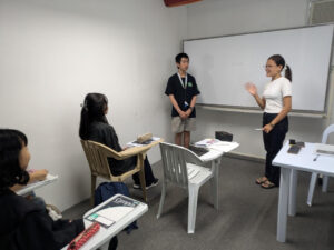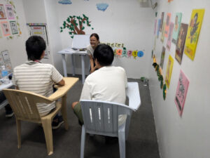 研修のメインである、英語のレッスンがスタートしました! 1対1の授業と3〜6名程のグループレッスンがあり、テキストを使って文法のレッスンをしたり、くじに書いてあるお題にそって話をしたり、自分の名前のアルファベットを使って、自分を表す形容詞を書いたりと、活動はバラエティに富んでいます。 生徒達は果敢にそれぞれのレッスンに挑んでいる様子でした。 レッスンを重ねていくごとにどんな成長があるか、楽しみです。また、隣接するモールに行って早速英会話を実践しています。今後は21日と23日の夜に生徒の声をブログにアップします。