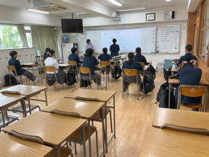 2年生の夏期講習では、5日間、既習事項の復習や応用問題に取り組みました。少人数の講習は学期中の課題やつまずきを解決しやすく、理解もより進んだようです。3年生で行われる特別進学学習と同じスタイルで行うことにより、来年の今頃を想像し、意識も高まったと思います。講習で得た経験を土台に、今後の学習に全力で臨んでほしいです。