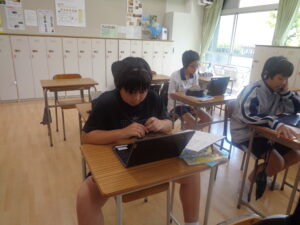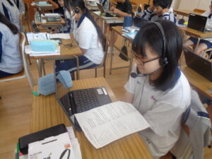 本校の英語教育は「使える英語」を目指して、日々の授業に取り組んでいます。1年生は1学期間で蓄積した英語力に基づき、2学期よりオンライン英会話がスタートしました。週に約1回Chromebookを使って海外の外国人講師とマンツーマンのレッスンを行い、英語のアウトプットの機会としています。初回ということで初めは緊張している様子でしたが、”What’s your name?”のような既に知っている表現からレッスンがスタートするため、段々と笑顔が見えてきました。終わった後は「意外と短かった」「知っている単語を使えた」等の声があがり、それぞれ手応えを感じていた様子でした。日頃の授業でも音読や表現活動を重視し、オンライン英会話と合わせて英語で表現する力を高めていきます。