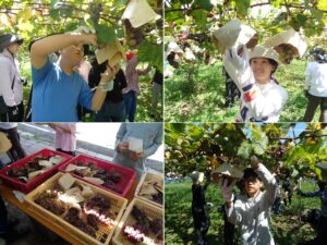 合宿2日目の午前中は農園にて、ぶどうの収穫とぶどうにかけてあった傘を取り外す作業を行いました。立ったままの仕事は大変でしたが、それぞれが得意な工程を担当し、力を合わせて取り組みました。