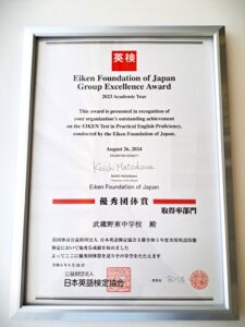 昨年度に引き続き、英検協会より「優秀団体賞」をいただきました。これは在校生徒数に対する英検取得者数が多い団体に与えられる賞で、本校は今回で通算5回目の授賞となります。2023年度は中学3年生の25%が2級(高校卒業程度レベル)以上に合格、85%が準2級(高校中級程度)以上に合格するなど顕著な成績を収めました。