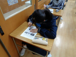 今回は「人生の終い方」をテーマにした映像を視聴しました。生徒にとっては自分の人生の最期について考える機会はなかなかありません。授業の初めは実感の湧かない様子でしたが、「終い方」を考えることで、生きている今の時間の過ごし方を見直すきっかけになったようでした。