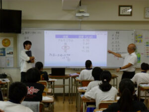 本校では、教科の枠にとらわれない教科横断型の授業を「コラボ授業」と称してカリキュラムに組み込んでいます。今回は1年生の授業で、理科で学習した密度について、数学の比例の知識を基に考える授業を行いました。