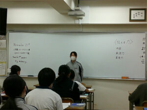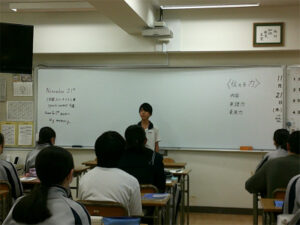 本校では、英語で伝える力を試す場として、学期ごとに全員が英語でスピーチを行っています。今学期のテーマは、1年生が”My Favorite”、2年生は”My Memory”です。テーマに合わせた原稿は自分で考え書き、先日の学園祭で展示したものです。今回は来月行われる英語スピーチコンテストのクラス予選も兼ねています。発表の後は、ALTのアレックス先生から英語で講評がありました。英語の文法、発音のアドバイスや、より自分の想いを伝えるための視線の位置のアドバイスがあり、生徒たちは次に活かそうと真剣に聞き入っていました。