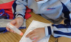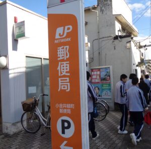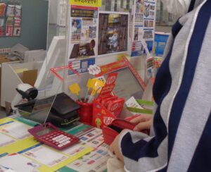 体験授業で郵便局を訪れました。スーパーマーケットでの買い物とは異なり、郵便局では窓口で「年賀はがき(インクジェット)」や「110円の切手」など、自分が買いたい商品とその個数を直接伝える必要があります。