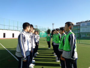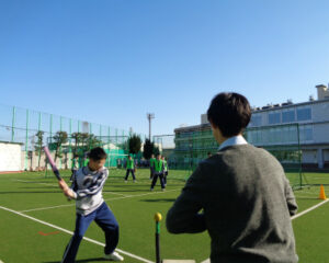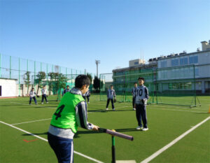 3学期の体育では、ソフトボールに取り組んでいます。はじめに、グローブを使ってボールを捕ること、ティーに乗せたボールをバットで打つことなどの基礎練習に取り組みました。キャッチボールをたくさん行い、道具に慣れてきたら、次は、捕ったら投げる、打ったら走る、といった動作の練習です。そして、それらを組み合わせて、いよいよゲームです!ゲームは、ティーに乗せてあるボールを打ったら一塁側にあるコーンを回ってホームベースに戻る、守備の人はボールを捕ったらホームベースに向けて送球する、というシンプルなルールで行いました。クラスごとの体育だけでなく、クラス対抗戦なども行い、チームで声援を送り合う姿も見られ、大いに盛り上がっています。