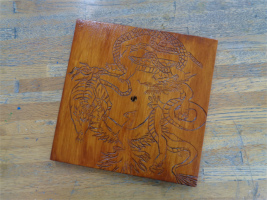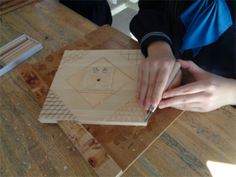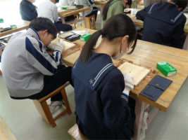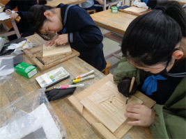 3年生AB組の美術では、卒業制作として「木彫時計」の制作に取り組んでいます。これが美術での最後の課題となり、卒業をテーマに自分の興味について振り返り、形と色で表現していきます。手順としては、下絵を考えて木材に写し、彫刻刀で少しずつ木材を彫りながら造形していきます。その後、アクリルガッシュなどで着彩し、ニスを塗って仕上げます。中学校での作品制作は絵画表現が中心でしたが、慣れない彫刻刀での表現もコツを掴み、手を止めることなく黙々と彫り進めています。絵画では表すことができない彫刻表現の魅力やたのしさを感じ取っているようです。