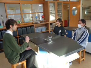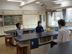 本校常駐のALTであるアレックス先生と、放課後の英会話の時間を設けています。生徒はペアになり、アレックス先生と自由な話題で英会話をします。趣味や最近の出来事を話すだけでなく、先生の出身国であるイギリスとの違いを学んだり、生徒が日本のことを教えたりすることもあります。授業とはまた違った、より生き生きした英語を学ぶ時間になっています。