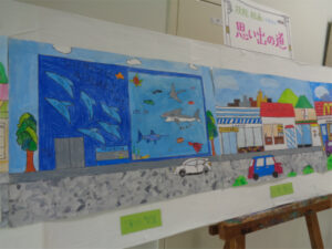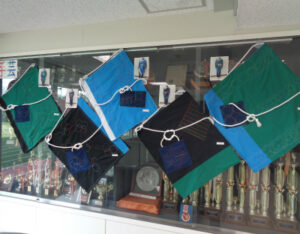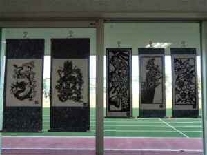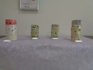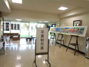 CDE組は週に2回「技能」の授業があり、陶芸、絵画、手芸、切り絵、クラフト、PC、器楽の中から1つ選んで1年間取り組みます。現在、中学校のロビーでは、3年生が技能のまとめとして作った「卒業制作」を展示しています。それぞれの生徒が根気よく丁寧に作り上げた力作ぞろいです。