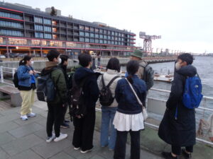 その後、班ごとに桜木町から赤レンガ倉庫までのガイドウォークツアーです。横浜開港以来の鉄道や物流の歴史を、実際に古くから残る線路やドックなどを見ながら教えていただきました。長時間のコースでしたが、歴史の授業との関連を発見しながら興味深そうに聞いている様子が見られました。